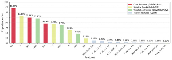 To quantify the importance of color features and other features in classification, we calculated feature importance. As shown in Figure 9, the red bars represent color features, the yellow bars represent the original band, the green bars represent vegetation features, and the gray bars represent texture features. Among them, three color features are in the top five. Feature ExB has an importance of 17% and ranks first, with ExB importance greater than the B band, ExG importance greater than the G band, and ExR importance greater than the R band. The ten texture features are at the bottom and all below 1.5%, indicating that texture features have a minor influence. This may also suggest that the boundaries of vegetation distribution are blurred, with no clear or fixed texture. Except for SAVI, which has a relatively low importance, the importance of other vegetation features and original bands is all greater than 5%, indicating that they also have some influence in classification. In summary, color features indeed play a significant role in extracting salt marsh vegetation in YRD, further validating that color features contribute to the improvement in OA.