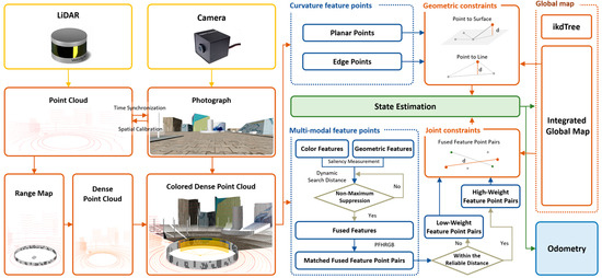 However, LiDAR can only capture the geometric information of the environment, which may lead to positioning or mapping issues, especially in environments like tunnels or long corridors that lack a distinct geometric structure or have repeated geometric patterns. These similar geometric structures and their proximity in the map can lead to errors in the frame-to-frame matching and frame-to-map matching processes of LiDAR odometry, ultimately resulting in significant confusion in odometry estimation and rendering the map construction unusable. In these narrow environments, the close proximity of the sensor to the walls results in highly dense laser points on the walls. Many algorithms tend to ignore features that are too close, too dense, and structurally homogeneous to improve processing speed and stability. Moreover, operators following behind in narrow environments further exacerbate the errors in LiDAR odometry, preventing the full utilization of LiDAR’s 360° field of view and long-range detection advantages in such settings. Additionally, the 16-line LiDAR point cloud provides much sparser information in the vertical direction compared to the horizontal direction. This disparity causes many SLAM algorithms relying on LiDAR to exhibit good accuracy on the horizontal plane but significant vertical deviations, often resulting in odometry or mapping curling along the z-axis. In contrast, due to different principles of feature extraction, the forward-facing monocular cameras usually perform well in such environments. However, they also have inherent issues such as high computational load and scale ambiguity. Therefore, effectively integrating the advantages of both sensors to develop a lightweight LiDAR–vision fusion SLAM algorithm in narrow and structurally similar environments is a key focus of current research.