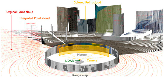 The image illustrates the process of constructing a range map from the LiDAR point cloud and integrating it with a monocular camera to generate a dense colored point cloud. The red points represent the original LiDAR point cloud, while the orange points denote the interpolated LiDAR points. By overlaying the camera image, the LiDAR points within the camera’s field of view are assigned to the corresponding color at each position.