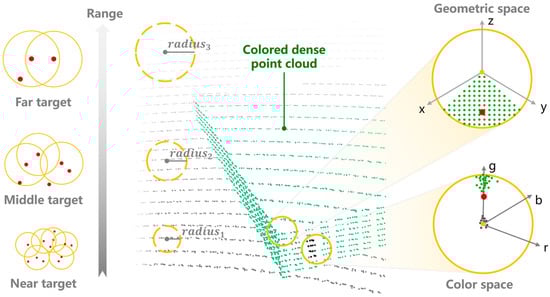 Next, we extend our consideration to the color space of the colored point cloud. In the color space, treating the color coordinates equivalently to the geometric coordinates allows us to find the color centroid in a similar way to the geometric centroid in the above geometric corner point query method, as illustrated in the “color space” of Figure 3. We search for corner points with drastic color changes within a varying search radius along with the changing distance of the point cloud. The basic formula is as follows: