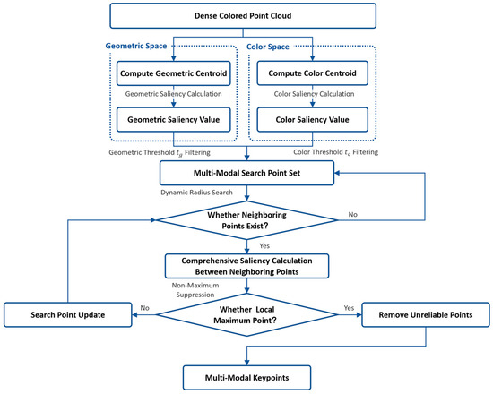 Finally, appropriate feature point selection is performed. We choose a suitable geometric distance threshold and color distance threshold to remove feature points with insignificant geometric and color features. Among the remaining feature points, we select those with the best geometric and color characteristics based on saliency measurement. For example, on a flat floor, where geometric features are mostly planar, we would select texture points with distinct colors, such as brick joints. In cases where all points have similar colors, we prioritize geometric changes. By applying the nonlinear suppression algorithm to select the points with the highest combined saliency in the neighborhood, a multi-modal key point set can be obtained, as shown in Figure 4.