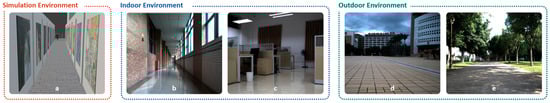 Simulation environment and real dataset environment demonstration; (a) represents the simulation environment, which includes a 70 m long corridor to verify the reliability of our proposed algorithm in similar environments. Four groups of datasets were selected for the real-world environment, corresponding to different working conditions: long similar indoor environment (b), indoor rooms environment (c), long-distance outdoor environment (d), and similar outdoor environment (e).