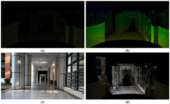 The original LiDAR point cloud is 16-line, which provides sparse information for similar indoor environments. This is particularly true in the vertical direction, where the density of the point cloud is much lower than in the horizontal direction. As a result, many SLAM algorithms relying on LiDAR exhibit good accuracy on the plane but significant vertical deviations, often leading to odometry or mapping curling along the z-axis. Compared to outdoor environments, indoor environments are simpler in terms of both the number of obstacles and the geometric structure of the space. In closer proximity, dense point clouds can cover most of the space with fewer blind spots. Therefore, enhancing the information on the z-axis in indoor environments through point cloud interpolation is a rapid and stable method. Moreover, depth estimation using monocular cameras is currently complex and suffers from scale uncertainty. By using LiDAR coloring for point cloud depth estimation, we can complement the weaknesses of both sensors. The results of the interpolated and colored point cloud are shown in Figure 6. The colored dense point clouds provide more information compared to the sparse 16-line point clouds. The interpolated point cloud maintains the original LiDAR points’ layout, interpolating the 16-line points to a 128-line point cloud. This enhances the utilization of point cloud information and adds color information to the geometric data, increasing the reliability of localization in similar environments.