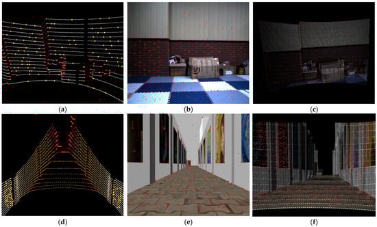 Finally, for coloring the point cloud, precise calibration of both the LiDAR and monocular camera is conducted. In this paper, Zhang’s method [44] is employed to determine the intrinsic parameters of the camera, enabling the accurate rectification of camera images. Additionally, LiDAR–camera joint calibration [45] is conducted to establish the relative spatial alignment between the LiDAR and monocular camera, enabling data integration and point correspondence for coloring. The coloring and extrinsic transformation formulas are as follows: