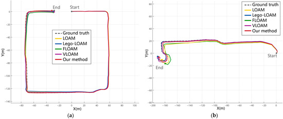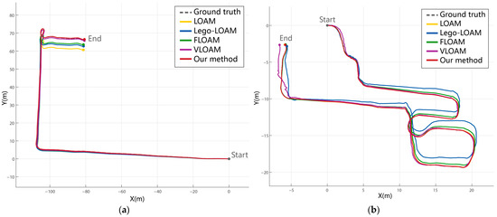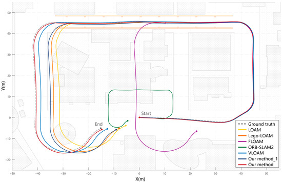 To validate the odometry performance improvement of our proposed fusion algorithm compared to classical SLAM algorithms in similar indoor environments, we selected several algorithms for comparison. Among pure LiDAR SLAM algorithms, we chose LOAM, FLOAM, and LeGO-SLAM, while for monocular visual SLAM, we selected ORB-SLAM2. For LiDAR–vision-fusion-based localization, due to the limited availability of open-source options, we employed VLOAM, which combines a monocular camera with a mechanical LiDAR as a reference.