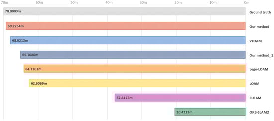 As shown in Figure 8, in the street area with clear scene hierarchy and abundant geometric features, the performance of the algorithms is generally consistent. At the starting point, the trajectories of the algorithms almost overlap, demonstrating good accuracy in the initial stage. However, once entering the long corridor area, the differences between the odometry algorithms become apparent. To further analyze their performance in this challenging environment, we extracted the planar trajectories from the long corridor region and presented a detailed comparison in Figure 9. Among them, FLOAM exhibits the most severe point cloud degradation, with the odometry in the tunnel measuring only half of the true value. This is related to its scan-to-map odometry matching approach and the sacrifice of some convergence iterations for computational efficiency. While it maintains good localization in the geometrically rich street environment, the reduced iteration speed becomes a disadvantage when geometric features decrease, resulting in significant degradation. LOAM and LeGO-LOAM perform better but still show noticeable degradation in the long corridor. Since this study only utilizes a monocular camera, the classical visual algorithm ORB-SLAM2 can only determine scale through the initial two-frame estimation from the monocular camera. As shown in the figure, while the odometry performs well in the long corridor area, there is a noticeable scale estimation error.