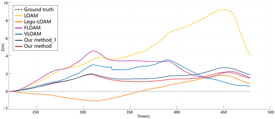In the elevation variation graph for this scene, as shown in Figure 10, our proposed method also demonstrates an advantage. One primary reason that LiDAR SLAM systems experience z-axis curling during localization and mapping is the excessive sparsity of point clouds in the vertical direction. By increasing the information along the z-axis during point cloud interpolation, vertical deviations are better suppressed. Among the algorithms, LOAM exhibits significant z-axis estimation errors. LeGO-LOAM, with ground constraints, performs well but exhibits a maximum to minimum error range difference exceeding 3 m. VLOAM performs well overall; however, it experiences elevation jumps in the long corridor region, which is one of the contributing factors to odometry degradation observed in the planar trajectory results. Our proposed method increases the amount of information in the elevation direction, maintains the error range difference within 3 m even without ground constraints, and achieves superior z-axis localization performance compared to many LiDAR SLAM methods, with a significant improvement in computational efficiency.
