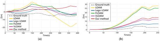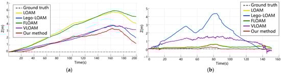 In the outdoor tree-lined path environment (Figure 13b and Figure 14b), more pronounced trajectory differences were observed. For planar accuracy, LOAM and FLOAM performed the worst, showing substantial deviations from the other three algorithms at the endpoint. The elevation results exhibited even larger disparities: LeGO-LOAM, aided by ground constraints, achieved the best performance and VLOAM and our method ranked next, whereas LOAM and FLOAM accumulated elevation errors exceeding 25 m over a 200 m trajectory, indicating a significant reduction in reliability in large-scale long-distance scenarios.