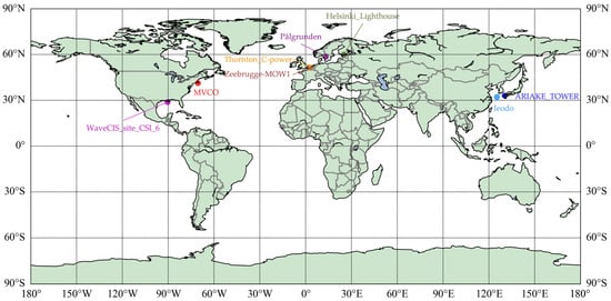 The AErosol RObotic NETwork—Ocean Color (AERONET-OC) system provides critical support for water color data calibration and quality assurance. Each station employs modified CIMEL radiometers measuring water color wavelengths (e.g., 412, 443, 488, 510, 551, 667, 870, and 1020 nm with about 10 nm bandwidth) to acquire key parameters: water-leaving radiance (Lw), normalized water-leaving radiance (Lwn), and aerosol optical thickness (τa). AERONET-OC data products are classified into three tiers: Level 1.0 (unscreened data), Level 1.5 (cloud cleared and quality-controlled data), and Level 2.0 (quality assured data) [20]. All tiers are publicly accessible through the AERONET portal (http://aeronet.gsfc.nasa.gov/, accessed on 1 January 2025). The f/Q-corrected products (Lwn_f/Q) were excluded from validation and analysis procedures due to concerns that chlorophyll concentration-based f/Q corrections, while effective for high-reflectance waters, may inadequately perform in turbid aquatic environments [20] and induce spectral overcorrection in suspended particulate matter-dominated systems [3]. To ensure maximum reliability and objectivity, this study utilizes Level 2.0 Lwn_IOP products [21]. ρw is calculated as Lwn/F0 × π, where F0 is the solar irradiance following Thuillier et al. [22]. For accuracy assessment, satellite observations were matched to AERONET-OC measurements within ±30 min of the overpass. When multiple AERONET-OC data met this criterion, linear interpolation was applied to the two spectra bracketing the overpass time. The eight AERONET-OC stations presented in Figure 1 were selected based on comprehensive criteria, including the requirement for a sufficient number of high-quality matchups with satellite observations [23,24] and the need for representation across diverse aquatic environments, specifically encompassing both coastal and offshore waters. This selection yielded a dataset comprising over 800 spectral observations spanning turbid waters, phytoplankton-dominant waters, algal bloom waters, inland waters, and open ocean waters to evaluate multi-source remote sensing data quality and reconstruction accuracy. Measuring periods of the selected stations and the number of matchups are provided in Table 1.