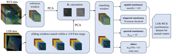 In addition to spatiotemporal–spectral consistency validation, the training dataset compilation integrated supplementary quality control criteria to ensure spectral coherence between LOS and WCS observations. Key metrics included the τa difference threshold at 550 nm (Δτa(550) < 0.5) for quasi-synchronized acquisitions and land cover classification restricted to the ocean. Using these constraints, the study systematically assembled quality-controlled quasi-synchronized reflectance data and τa(550), establishing a spatiotemporally consistent LOS-WCS spectral dataset. The integrated workflow from data filtering to product generation is schematically summarized in Figure 2.