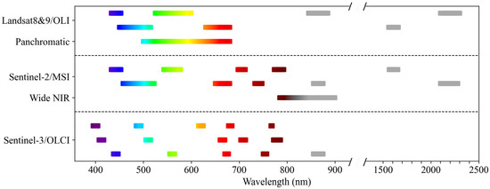 Spectral band positions and bandwidths of Landsat-8&9/OLI and Sentinel-2/MSI served as input data, and Sentinel-3/OLCI served as output targets. Visible bands are colored according to their spectral regions, while near-infrared bands are indicated in gray.