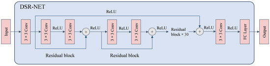 Residual blocks mitigate gradient vanishing and are thus widely employed for complex spectral reconstruction problems [32,33,34]. DSR-Net employs a residual neural network architecture comprising 32 stacked residual convolutional blocks (Figure 4). Each block integrates two convolutional layers with ReLU activation functions and output scaling (×0.1), supplemented by residual skip connections to preserve gradient flow. This architecture addresses vanishing gradient challenges while optimizing feature reuse efficiency. The framework adapts channel dimensions to accommodate multi-source LOS data inputs, resolves nonlinear spectral mapping relationships between LOS and WCS bands, and achieves robust reconstruction through end-to-end training.