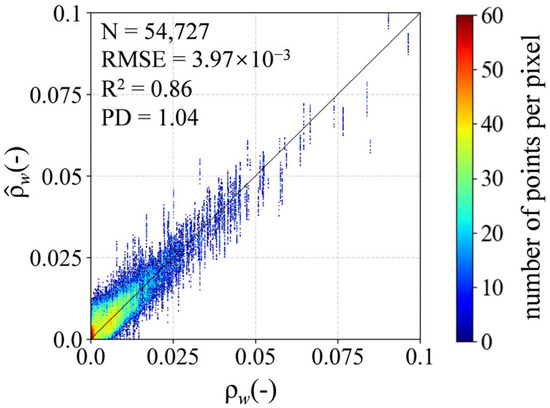 where xi represents in situ measured ρw, and yi represents either atmospheric corrected or model-reconstructed ρw. R2 quantifies the agreement between xi and yi, RMSE characterizes their absolute discrepancy, and the PD indicates their relative deviation. A positive PD value indicates overestimation in corrected or reconstructed reflectance, while a negative value indicates underestimation.