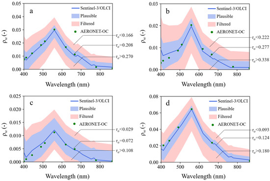 For bio-optical filtering validation, the TOA reflectance, spectral band configurations, solar and satellite geometries (obtained from Sentinel-3/OLCI products), as well as the atmospheric and aerosol condition (inferred from the acquisition date and underlying surface conditions) are treated as known quantities, while τa(550) is input as a random variable into the 6SV radiative transfer model. Subsequent spectral validation against AERONET-OC measurements confirmed the filter’s capability to constrain uncertainties, with detailed analysis presented in Section 4.3.1.