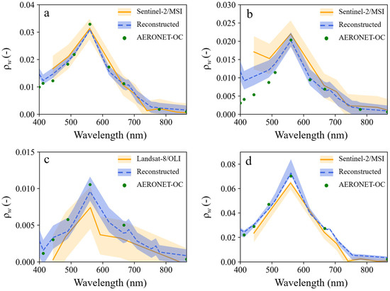 To further investigate the distribution patterns of atmospheric correction errors across water categories, four representative water categories were analyzed. As shown in Figure 6, ρw products of ACOLITE exhibit strong agreement with in situ measurements for all four water categories, except for systematic overestimations in the blue bands. Simulated ρw values gradually decrease as τa(550) increases, eventually being flagged as implausible by bio-optical models. Notably, while bio-optical constraints ensure the physical plausibility of ρw, they do not ensure absolute accuracy, particularly in blue bands where reflectance enhancements may ambiguously originate from reduced CDOM absorption or amplified adjacency effects. This critical uncertainty diminishes DSR-Net’s reconstruction fidelity in nearshore environments. Validation across the four water classes demonstrates that bio-optical data control methods remain effective under diverse water and aerosol conditions, successfully suppressing both over- and underestimation of τa(550) and improving ρw observational precision.