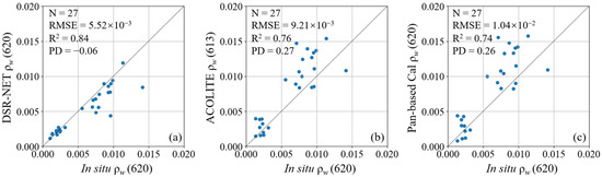 Cross comparison of multiple orange band reconstruction methodologies against in situ measurements. (a) DSR-Net reconstruction at 620 nm; (b) ACOLITE reconstruction at 613 nm, following the methodology of Castagna et al. [17]; (c) PAN-based calibrated reconstruction at 620 nm, following the methodology of Niroumand-Jadidi and Bovolo [10].