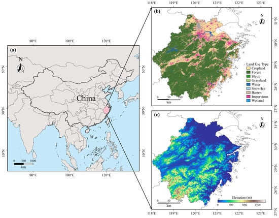 Study area overview: (a) Location of Zhejiang Province; (b) Land use classification map of Zhejiang Province; (c) Digital Elevation Model (DEM) representing the topographic variation.