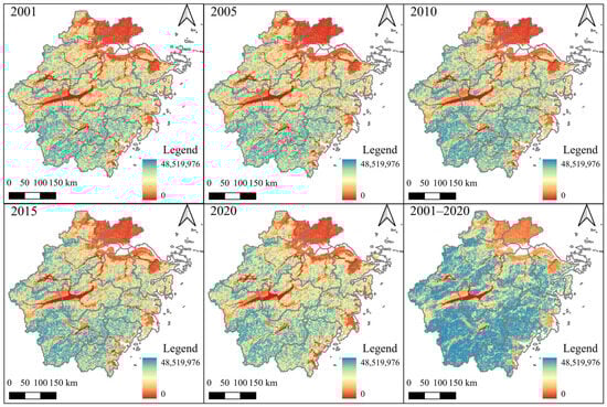 Figure 3 illustrates the spatial distribution characteristics of SCS in Zhejiang Province from 2001 to 2020. The results indicate that SCS exhibited marked spatiotemporal heterogeneity across the province over the study period. During the period 2001–2020, areas with high soil retention capacity were mainly concentrated in the mountainous regions of the west and south, such as southwestern and western Zhejiang. These areas largely overlapped with forest land and demonstrated strong soil conservation capacity. In contrast, the plains and urbanized regions (e.g., around Hangzhou and Ningbo) generally showed lower levels of SCS. This was especially evident in coastal zones and urban expansion areas, where SCS were relatively weak. From a temporal dimension, soil retention capacity declined in some areas between 2001 and 2015, but showed signs of recovery in certain regions by 2020. Overall, the spatial pattern of SCS in Zhejiang Province from 2001 to 2020 can be described as stable in mountainous areas, declining in plains, and partially recovering in transitional zones. These spatial dynamics reflect the impact of land-use changes and anthropogenic disturbances on ecosystem functions related to SCS.