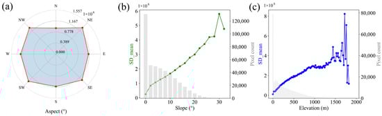 Topographic Influences on soil conservation services in Zhejiang Province: (a) aspect, (b) slope, and (c) elevation.