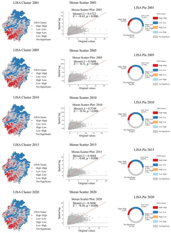 Figure 6 presents the results of spatial autocorrelation analysis of SCS in Zhejiang Province for the years 2001, 2005, 2010, 2015, and 2020, including LISA cluster maps, Moran scatter plots, and LISA cluster proportion pie charts. Overall, SCS in Zhejiang Province exhibited significant positive spatial autocorrelation in all years, with Global Moran’s I values remaining stable at approximately 0.57 (e.g., 0.5696 in 2020), and significance tests passed in all cases (p = 0.000). This indicates a strong spatial clustering pattern of SCS. The LISA cluster maps further reveal the spatial distribution of clustering types. High–High clusters are mainly concentrated in the mountainous areas of southwestern Zhejiang, such as Lishui and Quzhou, reflecting the strong soil retention capacity and high ecosystem stability of these regions. In contrast, Low–Low clusters are primarily distributed around urban expansion zones and coastal plains in cities like Hangzhou and Ningbo, indicating areas with intense land development and weaker ecological function. The spatial heterogeneity represented by High–Low and Low–High clusters is relatively limited, accounting for less than 2% in all years, suggesting that extreme heterogeneity in soil retention values is minimal and that the regional structure remains relatively stable. According to the pie charts, the proportion of High–High clusters remained essentially stable from 2001 to 2020 (around 16.22%), while the proportion of Low–Low clusters slightly increased (from 33.95% to 34.45%). Meanwhile, the proportion of non-significant areas slightly decreased (from 46.1% to 47.13%), indicating a slight enhancement in spatial clustering in some areas. In summary, SCS in Zhejiang Province has consistently maintained a clear spatial clustering pattern over the past two decades. The mountainous regions in the southwest are key providers of ecosystem services and should continue to be protected. In contrast, coastal and plain areas require strengthened soil and water conservation measures to improve overall ecosystem function and resilience.