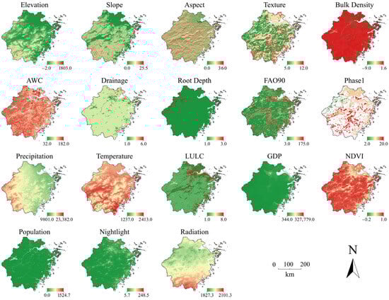 Figure 7 illustrates the spatial distribution patterns of the major natural and socio-economic factors involved in the driving force analysis of soil retention in Zhejiang Province. These factors fall into five categories—topography, soil, climate, land use, and human activities—and include a total of 17 specific indicators. Among the topographic factors, elevation, slope, and aspect show distinct east–west differences, with higher elevations and steeper slopes concentrated in the western mountainous regions, providing favorable natural conditions for soil retention. For soil-related factors, texture, bulk density, available water capacity (AWC), drainage, root depth, FAO90 soil classification, and soil phase (Phase1) exhibit complex and diverse spatial variation, playing key physical and chemical regulatory roles in the soil retention process. In terms of climate factors, precipitation and temperature display clear latitudinal gradients—higher in the southwest and lower in the northeast—affecting both soil erosion and vegetation growth dynamics. The spatial patterns of LULC and NDVI reflect the impact of land management practices and vegetation cover conditions on soil retention. Socio-economic factors include GDP, population density, nighttime light, and radiation. These indicators reveal the spatial intensity of human activities, with GDP and nighttime light data showing particularly high values in coastal areas and urban agglomerations, indicating strong anthropogenic disturbances and potential ecological threats. Overall, the combined influence of these factors shapes the spatial patterns and dynamics of SCS in Zhejiang Province. In the subsequent analysis, the contributions of these variables will be quantified using machine learning models such as XGBoost and SHAP analysis. This approach will help identify the dominant drivers and key impact areas, thereby providing scientific support for formulating targeted ecological conservation strategies and land-use policies.