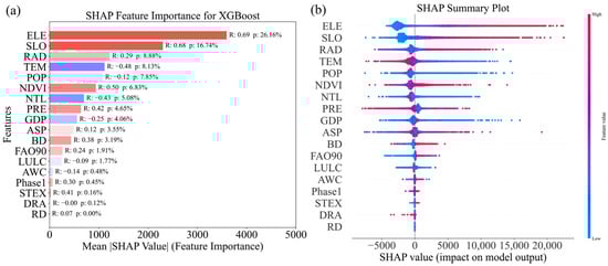 SHAP-based interpretation of variable contributions to soil conservation services using the XGBoost model. (a) Feature importance ranking based on mean absolute SHAP values. (b) SHAP summary plot showing the direction and magnitude of each variable’s influence, with color representing the feature value.