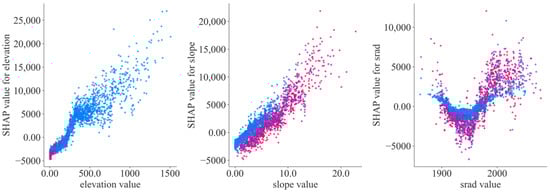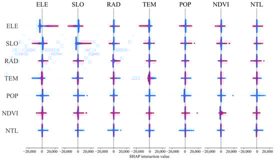 SHAP-based interaction analysis among major driving factors affecting soil conservation services. Red indicates high feature values, and blue indicates low feature values.