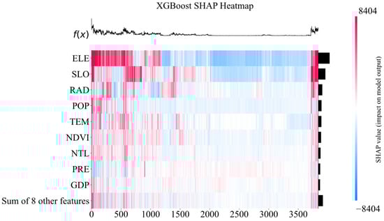 To further identify the overall influence patterns of driving factors on SCS, this study generated a SHAP value heat map (Figure 11), which intuitively illustrates the contribution direction and magnitude of each variable at the sample level. The color scale ranges from blue (negative impact) to red (positive impact), revealing the heterogeneous contributions of different factors across spatial units. From the overall distribution, socio-economic factors such as population density (Population), GDP, and nighttime light exhibit relatively high SHAP values in most samples, indicating a stronger driving effect on SCS. Their contributions are predominantly negative, emphasizing the significant suppressive impact of urbanization on ecosystem service functions. This trend is particularly evident in the upper part of the heat map, reflecting that areas with intense human activity tend to have weaker soil retention service capacity. However, the heat map also shows that natural factors such as elevation, slope, and NDVI generally exhibit lower SHAP values but contribute significantly and positively in certain samples. This indicates that natural geographical conditions still play a critical supporting role in specific regions. In mountainous areas with pronounced terrain variation, the composite landforms formed by these factors enhance surface stability and soil and water conservation capacity. Notably, some variables show clear bidirectional effects. For instance, population density (pop) and TEM display both positive and negative SHAP values across different samples, reflecting that their impacts are not fixed but dynamically adjust depending on the regional context. For example, in some peripheral mountainous regions, moderate population density may be associated with ecological restoration or agricultural management investments, thereby positively influencing soil retention capacity. In contrast, in urban expansion areas, these variables typically show negative effects. In summary, the SHAP heat map analysis indicates that the driving mechanisms of ecosystem services exhibit significant spatial heterogeneity and nonlinear response characteristics. Therefore, it is not appropriate to generalize the ecological effects of variables based solely on overall trends; rather, their impacts should be interpreted in conjunction with regional features and geographical context to capture their variability and complexity. This analysis provides valuable data support and decision-making references for achieving a balance between ecological conservation and urban development.
