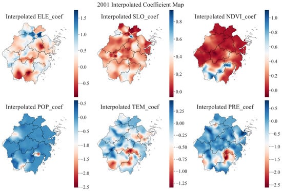 The superior performance of GWR can be attributed to its capacity to model spatially varying relationships, which the global OLS model cannot achieve [47]. For instance, GWR results revealed that slope and NDVI had strong positive effects on soil retention in mountainous regions, while population density and temperature exerted negative influences in urban areas. Moreover, the spatial distribution of GWR coefficients from 2001 to 2020 showed an expanding influence of natural factors and a gradual spread of negative anthropogenic impacts toward central Zhejiang [48]. These findings are consistent with previous research, and this study further extends their conclusions by providing a long-term comparative analysis. However, the GWR model remains computationally demanding and sensitive to parameter selection, indicating areas for future methodological improvement.