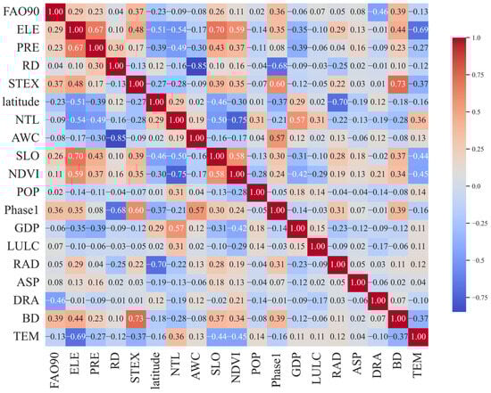 The correlation analysis in this study revealed significant relationships between soil retention and various natural, climatic, and anthropogenic factors (Figure 15). Overall, elevation, slope, and NDVI showed strong positive correlations with soil retention, indicating that terrain variability and vegetation cover are core natural drivers for maintaining and enhancing SCS [42]. In contrast, human activity intensity indicators such as population density, GDP, and nighttime light showed weak correlations with these natural factors, highlighting the independent influence and potential threat posed by anthropogenic disturbances on ecosystem services [43]. Additionally, precipitation was positively correlated with elevation and negatively correlated with temperature, reflecting the distinct north–south climatic gradient of Zhejiang Province. These key findings provide a theoretical foundation for subsequent driver analysis and spatial modeling. The mechanisms underlying these correlations suggest that topographic conditions and vegetation cover jointly determine the susceptibility to soil erosion and the capacity for soil retention [42]. Areas with high elevation, steep slopes, and high NDVI—mostly located in the central and western mountainous regions—benefit from favorable natural conditions and limited human disturbance, thus exhibiting stronger soil retention capacity. In contrast, coastal and urban areas characterized by high population density and economic development experience significant surface disturbance from activities such as urban expansion and agricultural development, which in turn reduce SCS [44]. This pattern is validated by the correlation heatmap, where, for example, the relatively high correlation between GDP and nighttime light (r = 0.57) reflects the pressure exerted by socio-economic development on ecosystem functions [45]. Compared with previous studies, the findings of this research are consistent with most conclusions related to ecosystem services. For instance, Luo et al. [46] demonstrated that mountainous areas possess higher soil and water conservation capacity due to complex terrain and abundant vegetation, while plains and urban areas are more ecologically vulnerable due to intense development. This study not only supports those conclusions but also further reveals the relatively independent correlation patterns between human activity factors and natural factors, emphasizing the importance of coordinated management of human–environment systems.
