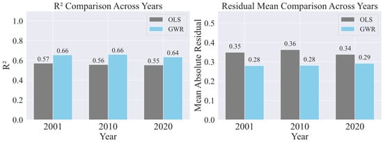 Comparison of OLS and GWR Model Fitting Performance in 2001, 2010, and 2020: R2 and Residuals.