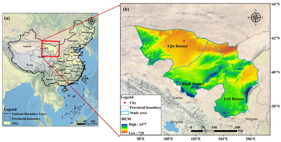 Location and topography of the study area: (a) The location of the Alxa Desert in China; (b) The topographic map of the Alxa Desert.