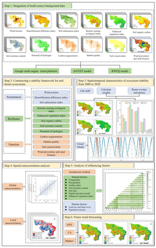 Ecosystem stability stands for the ability of an ecosystem to resist or deviate in response to disturbances, as well as its ability to recover after the disturbances are removed [1]. It is regarded as a critical indicator for assessing regional sustainable development and identifying the current state and future trends of the ecological environment. Arid desert regions (ADR) are key ecological zones and strategic barriers within the national ecological security system [2]. For a long time, ecosystems in this region have faced multiple environmental challenges, including water scarcity, intense wind erosion, and land desertification [3]. These factors have directly or indirectly disrupted the internal balance and stability of the ecosystem [4,5]. Since 2000, ecological conditions in ADR have significantly improved, driven by the continuous implementation of national ecological projects and rising environmental awareness [6]. Therefore, a thorough understanding of the spatiotemporal dynamics of ecosystem stability in ADR, as well as the projection of future trends, provides a theoretical foundation for ecological conservation and sustainable development.