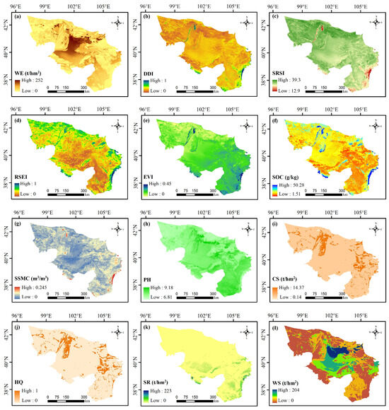 Spatial distribution of ecosystem stability indicators in the Alxa Desert. Note: (a) Wind erosion; (b) Desertification difference index; (c) Soil salinization index; (d) Remote sensing ecological index; (e) Enhanced vegetation index; (f) Soil organic carbon; (g) Surface soil moisture content; (h) Potential of Hydrogen; (i) Carbon sequestration; (j) Habitat quality; (k) Soil retention; (l) Wind prevention and sand fixation.