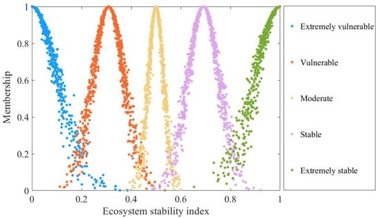 Ecosystem stability is classified into five levels: extremely vulnerable, vulnerable, moderate, stable, and extremely stable. Table 4 presents the evaluation values of the five cloud feature spaces, while the standard evaluation clouds representing ecosystem stability are depicted in Figure 4.