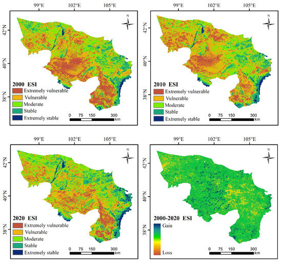 The ecosystem stability index (ESI) is used to represent the degree of ecosystem stability. A lower ESI value indicates lower ecosystem stability and greater ecosystem vulnerability [34]. The calculation method for the ESI is as follows [35]: