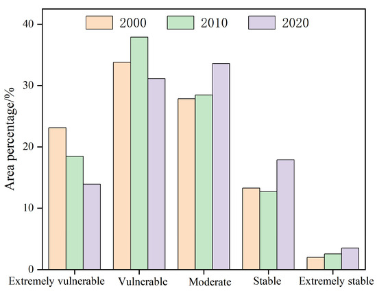 From a temporal perspective (Figure 6), ecosystem stability during 2000–2020 was predominantly at the vulnerable and moderate levels, constituting for more than half of the total area. The areas classified as moderate, stable, and extremely stable showed an increasing trend, with their proportions rising from 27%, 13%, and 1.9% in 2000 to 34%, 18%, and 3.5% in 2020, respectively. In contrast, the area classified as extremely vulnerable decreased from 23% to 13%. The proportion of vulnerable areas increased from 2000 to 2010, but decreased from 2010 to 2020, resulting in an overall decline of 2%. From the perspective of changes in ecosystem stability levels between 2000 and 2020 (Figure 7), significant transitions were observed among the extremely vulnerable, vulnerable, moderate, and stable categories. Notably, 10% of the area shifted from extremely vulnerable to vulnerable, 12.5% from vulnerable to moderate, 7.5% from moderate to stable, and 1.5% from stable to extremely stable. These transitions indicate that ecosystem stability in the study area is gradually improving.