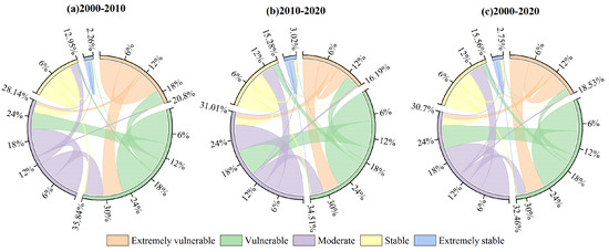 Transitions among different ecosystem stability levels during (a) 2000–2010, (b) 2010–2020, and (c) 2000–2020.