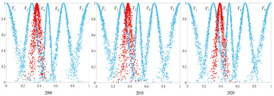Comprehensive evaluation cloud maps of ecosystem stability from 2000 to 2020. Note: Symbols V1, V2, V3, V4 and V5 represent extremely vulnerable, vulnerable, moderate, stable, and extremely stable levels, respectively. The x-axis indicates the evaluation values, and the y-axis represents the degree of membership.