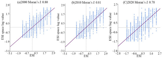 From 2000 to 2020, the global Moran’s I was approximately 0.80, with p-values all below 0.01, indicating a clear spatial clustering pattern and significant positive spatial autocorrelation of ecosystem stability at the 99% confidence level (Figure 9). The number of L-L and H-H type scatter points in the figure exceeds that of H-L and L-H types, indicating a tendency toward both high-value and low-value clustering in ecosystem stability. Among the three years, the Moran’s I value was highest in 2010, indicating the strongest spatial clustering of ecosystem stability in the Alxa Desert during that year, followed by a slight decline over time.