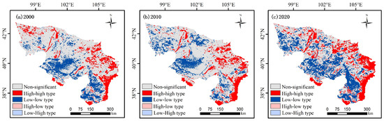 In terms of spatial patterns, areas classified as extremely stable were mainly situated in the Longshou Mountains, the Helan Mountains, and the Ejin Oasis. The main reason is that the Longshou and Helan Mountains have relatively high elevations, pronounced vertical zonation, and diverse plant communities. In particular, the Helan Mountains are influenced by the northwesterly monsoon, resulting in relatively abundant precipitation, which provides favorable conditions for ecosystem stability [48]. The Ejin Oasis relies on water supply from the Heihe River, with ecological water diversion projects (EWDP) ensuring sustained water availability, thereby supporting the stability of ecosystems within the oasis [49]. In contrast, areas classified as extremely vulnerable were commonly distributed in the Badain Jaran Desert and the Tengger Desert. This is mainly due to severe wind-blown sand erosion and limited precipitation, which leads to water scarcity and makes the ecosystem fragile [8]. Nevertheless, certain limitations remain. In Figure 5, the area classified as “extremely vulnerable” in the Badain Jaran Desert has significantly decreased. On the one hand, this reflects the positive outcomes of ecological restoration projects implemented in recent years. On the other hand, it is important to note that this trend may also be influenced by the raster-based overlay method used in this study for assessing ecosystem stability levels. Such methods are subject to spatial scale effects, which may obscure local ecological heterogeneity and result in an apparent but potentially overestimated improvement in desert areas [50]. These outcomes are aligned with spatial clustering patterns of ecosystem stability. H-H clusters are mainly distributed in areas with relatively favorable ecological conditions in the Alxa Desert, while L-L clusters are primarily located in areas classified as extremely vulnerable and vulnerable. Compared with 2000 and 2010, the L-L clustering areas expanded outward in 2020 (Figure 10), mainly due to the high difficulty of restoring extremely vulnerable regions and the uneven distribution of restoration resources. As a result, although the extent of low-value areas decreased, they became more spatially concentrated, thereby enhancing spatial clustering [51].