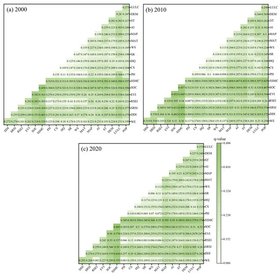 According to the results of the factor detector (Table 7), the p-values for the years 2000, 2010, and 2020 were all 0, indicating that the selected influencing factors had a significant impact on the spatial differentiation of ecosystem stability in the study area. Among the factors, SSMC, SOC and EVI exhibited the strongest explanatory power for the spatial differentiation of ecosystem stability, with average q-values of 0.298, 0.275 and 0.215 from 2000 to 2020, respectively. In addition, DDI, SRSI POP, AI, MAP, LULC, ST, and DEM also contributed to the spatial differentiation of ecosystem stability, with average q-values of 0.213, 0.198, 0.156, 0.152, 0.147, 0.146, 0.145, and 0.126, respectively. PH had the weakest explanatory power, with an average q-value of only 0.017.