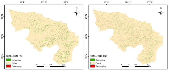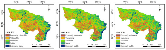 - Future forecasting results indicate that the area classified as vulnerable will decrease by 7.55% and 9.85% in 2030 and 2040, respectively, compared to 2020, while the area classified as stable will increase by 3.61% and 6.19%, respectively. This trend suggests that ecosystem stability in the Alxa Desert will continue to improve over the next two decades, particularly in the northern and southern areas of Alxa Left Banner and Alxa Right Banner.