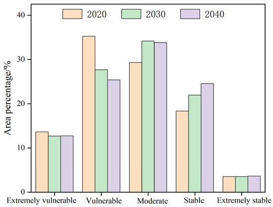 Drawing on the historical evolution of ecosystem stability, this study forecast the trends of ecosystem stability in the Alxa Desert over the next two decades. The results show that the region remains predominantly classified as vulnerable. However, the area under the vulnerable category is projected to decrease by 7.55% and 9.85% in 2030 and 2040, respectively, compared to 2020 (Figure 13), indicating a continued improvement in overall ecosystem stability. In recent years, various ecological projects have been actively implemented across the the Alxa Desert, including grazing prohibition and grassland restoration, the construction of TNSP, and desertification control. It has significantly contributed to the restoration of regional ecosystem structure and improvement of functions, providing strong support for the improvement of ecosystem stability in arid desert areas [65]. The future change trends in this region are compared with research findings from other regions. Using the CA-Markov model, Zhao et al. [66] forecasted that by 2025, the ecological vulnerability of the Central Plains urban agglomeration would be reduced, the ecological environment would be improved, and the stability of the ecosystem would continue to increase. Xu and Wang [67] forecasted, using a coupled GMOP and PLUS model, that under an ecological protection scenario, the ecosystem health of the Yellow River Basin will improve significantly by 2030. Wang et al. [68] conducted a forecasting analysis using a grey forecasting model and found that by 2030, the ecological carrying capacity in the Inner Mongolia Autonomous Region will gradually increase, leading to enhanced ecosystem stability. These studies suggest that under sustained ecological governance and policy interventions, various ecological regions generally exhibit a positive evolutionary trend characterized by improved ecosystem structure, enhanced functions, and increased stability. This trend is highly consistent with the patterns observed in the study region. Although the overall trend of ecosystem stability is improving, the results also reveal persistent ecological vulnerability in the southern part of Ejin Banner, the Badain Jaran Desert, and the Tengger Desert. These areas exhibit localized fluctuations or declining trends in ecosystem stability. This phenomenon is mainly attributed to frequent sandstorms, pest and rodent infestations, herbivory by animals, and urban development activities [8,9]. This suggests that despite the overall improvement in ecosystem stability, local ecosystems remain highly susceptible to external perturbations. It suggests that the Alxa Desert may still face significant degradation and ecological stress in the future.