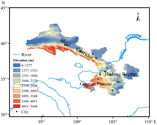 The topography of Gansu Province is shown in Figure 1. Located in the inland northwest of China, Gansu Province spans approximately 32°11′–42°57′N and 92°13′–108°46′E, stretching over 1600 km from east to west. The region features a long, narrow, and complex topography, including mountains, plateaus, plains, valleys, deserts, and the Gobi. The terrain slopes from southwest to northeast, situated at the convergence of the Tibetan Plateau, the Loess Plateau, and the Inner Mongolian Plateau. Most areas have elevations between 1500 m and 3000 m, characterized as a mountainous plateau. This complex topography results in diverse climate types, encompassing subtropical monsoon, temperate monsoon, temperate continental (arid), and plateau alpine climates. However, most areas within the province are dry, with arid and semi-arid regions accounting for 75% of the total area.