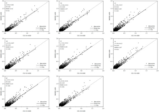 Comparison of the accuracy of MODIS AOD products and ground-based observation data: (a). DB-30 km
