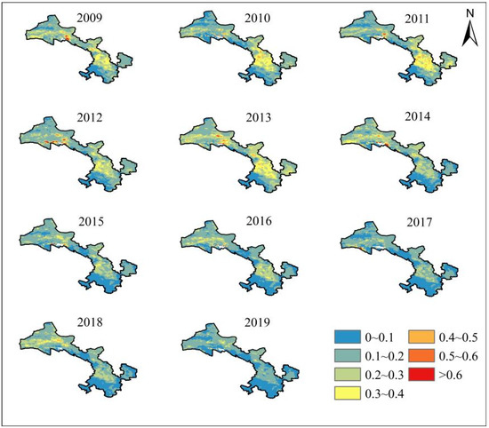 The annual mean AOD in Gansu Province from 2009 to 2019 exhibited significant changes. The high-value areas were mainly concentrated in the Hexi Corridor and Hedong region, while the low-value areas were distributed over the Qilian Mountains and Gannan Plateau. Before 2013, the high-AOD areas were larger, with regions exceeding 0.4 being more extensive; the AOD values in parts of the Hexi Corridor could reach over 0.6. After 2014, the provincial AOD values decreased significantly, and the low-value areas expanded continuously. Except for the western Hexi Corridor, the AOD values in other regions dropped to around 0.2.