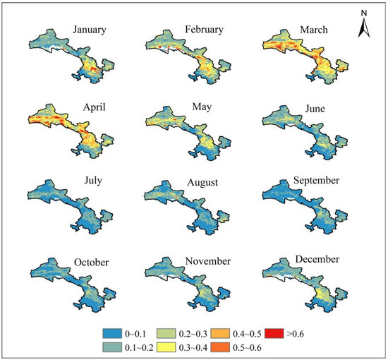 The monthly mean AOD distribution (Figure 4) shows that high values primarily occurred from January to May, with the most extensive coverage in spring (March–April). Sparse vegetation, low precipitation, and high wind speeds during winter and spring easily trigger dust events. Additionally, coal burning during the heating season and the stable atmospheric conditions in the Hedong region during winter, which hinder pollutant dispersion, favor the formation of fine-mode aerosols. Consequently, high AOD values emerged in central Hedong from December, intensified in January, and peaked and expanded province-wide in April. After May, with increasing precipitation and vegetation coverage, the high AOD areas gradually diminished, and no significant high-value zones were evident from July to November.