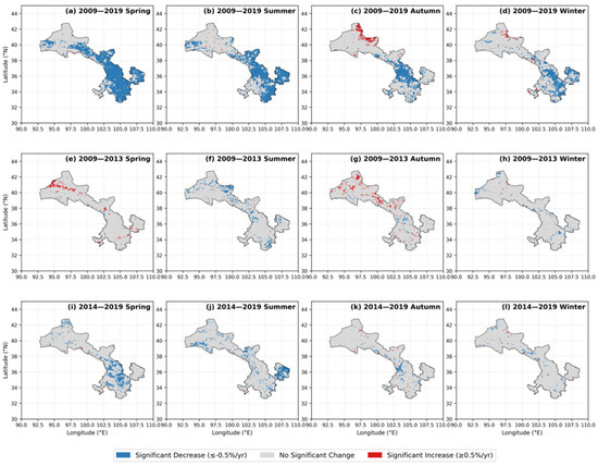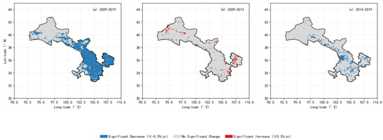 Based on the MK test results and Theil–Sen slope, the trend for each pixel was classified into three categories: significant decrease, significant increase, and essentially unchanged.