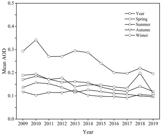 Characteristics of interannual and seasonal variations in AOD from 2009 to 2019.